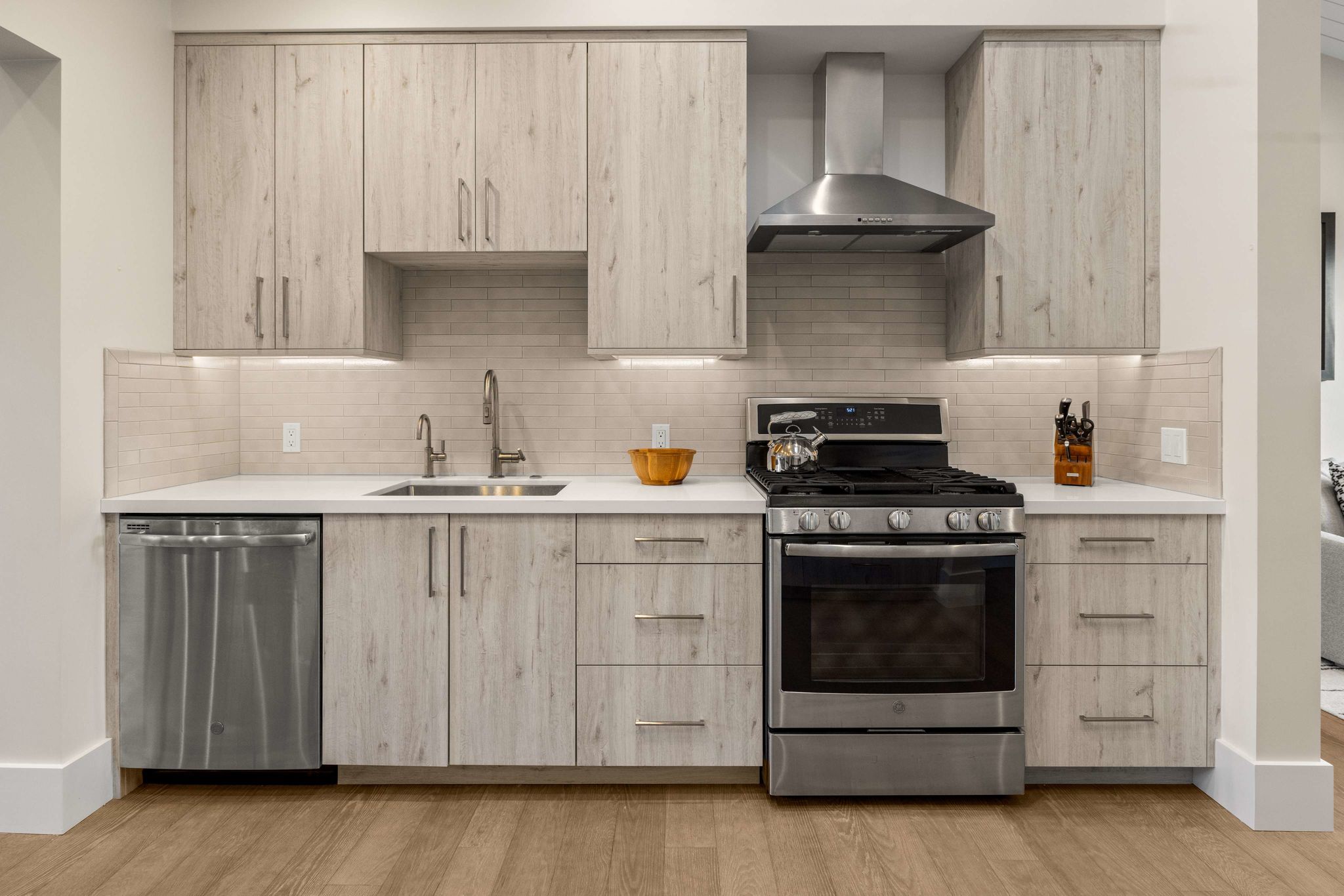 Quartz kitchen countertops and glazed ceramic tile backsplash