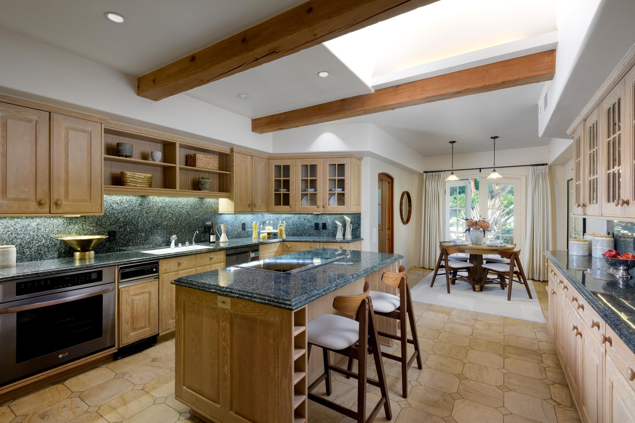 A palette of limestone, oak, marble, and tile grounds the interiors, materials chosen for their longevity and quiet character.