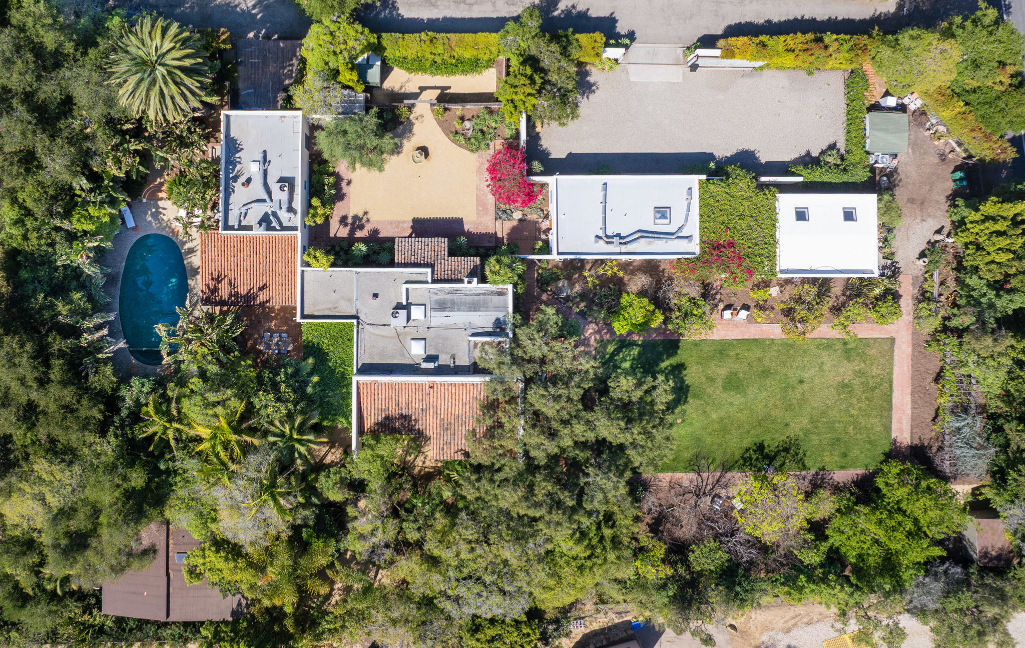 Designed for single level living, a collection of structures comes together to offer a 7 bedroom, 6.5 bathroom retreat across approximately one acre of lush, mature gardens.