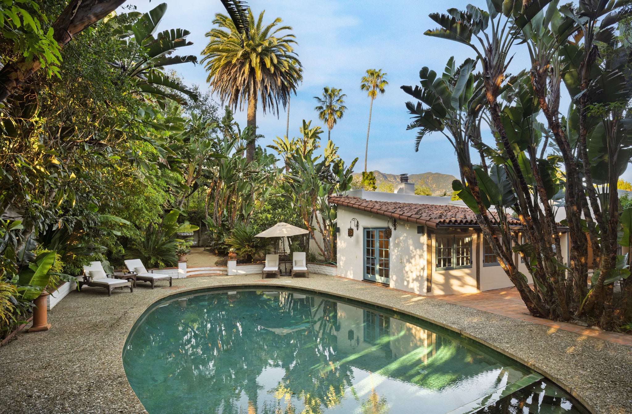 Sparkling pool surrounded by lush greenery